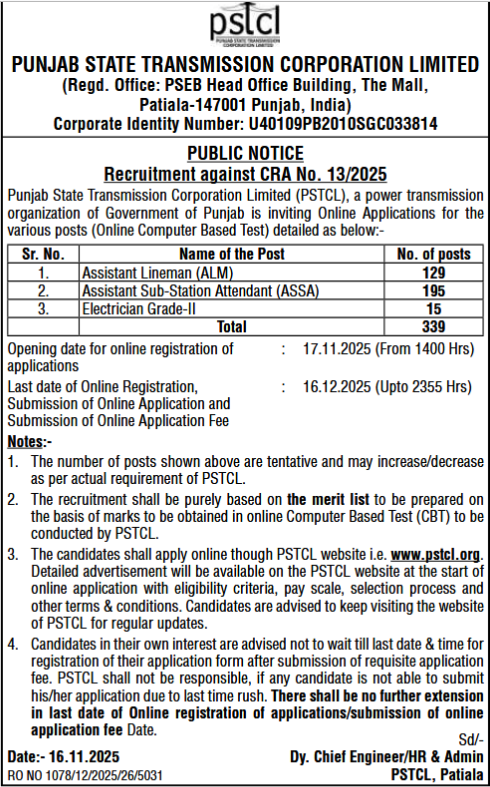Punjab State Transmission Corporation Limited (PSTCL) has released the official recruitment notification CRA No. 13/2025 for 339 vacancies including Assistant Lineman (ALM), Assistant Sub-Station Attendant (ASSA) and Electrician Grade-II posts.